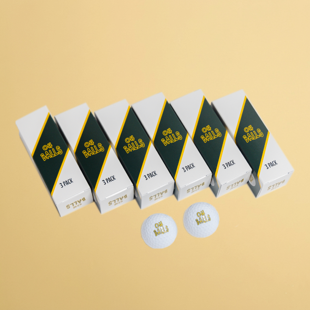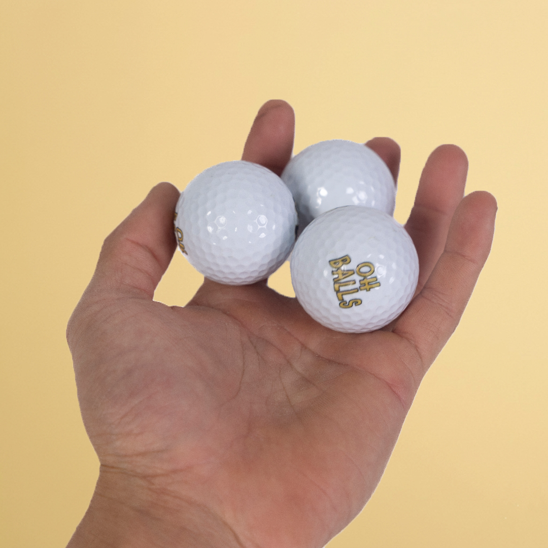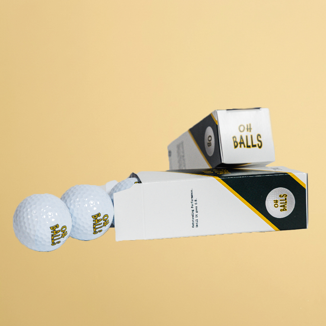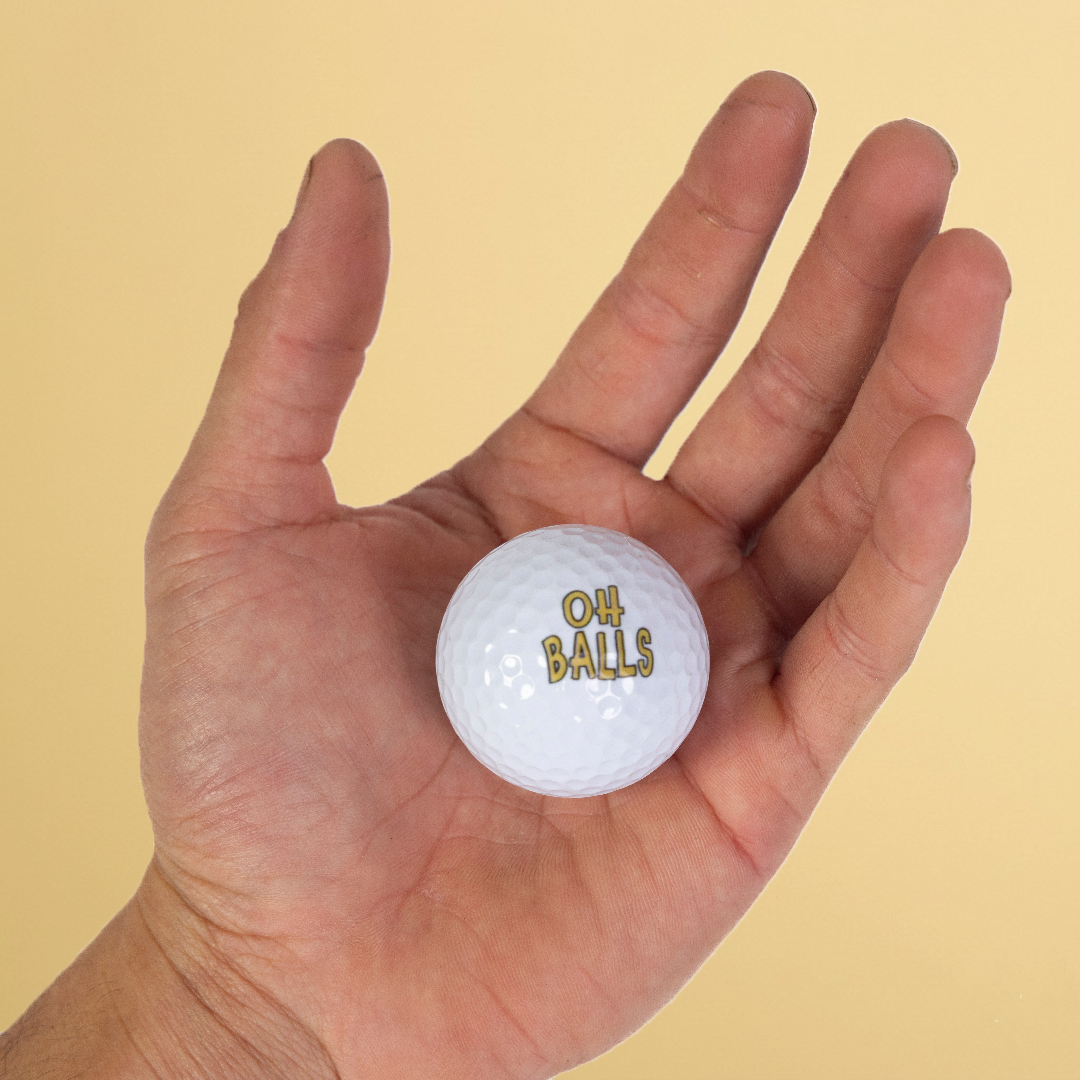 Our Signature Golf Balls (3-Pack) feature Oh Balls printed on one side and the OB logo on the